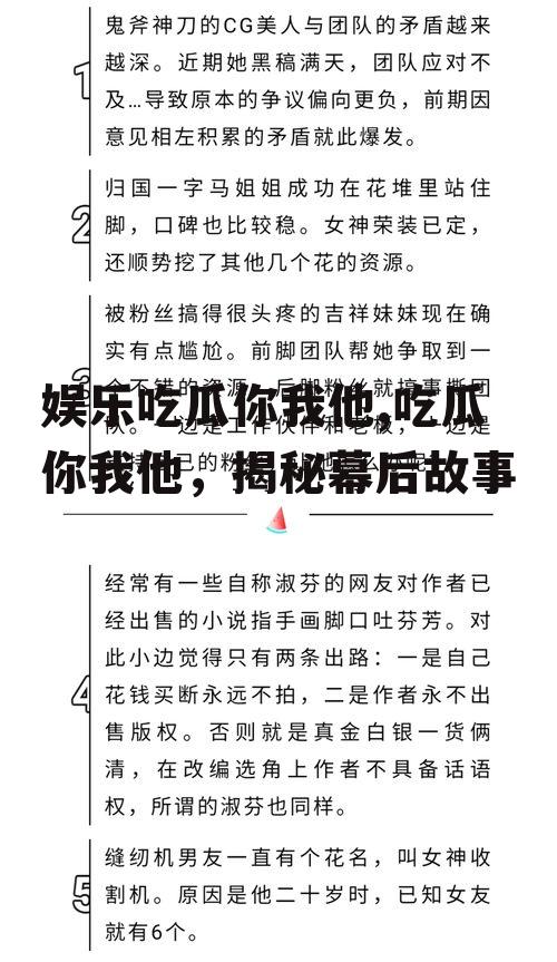 亲爱的读者们,娱乐圈的“瓜”真是无处不在,它们让我们在忙碌的生活中找到了乐趣,也让我们更加关注这个五彩斑斓的世界。那么,你最近又看到了哪些有趣的“瓜”呢?快来评论区分享吧!